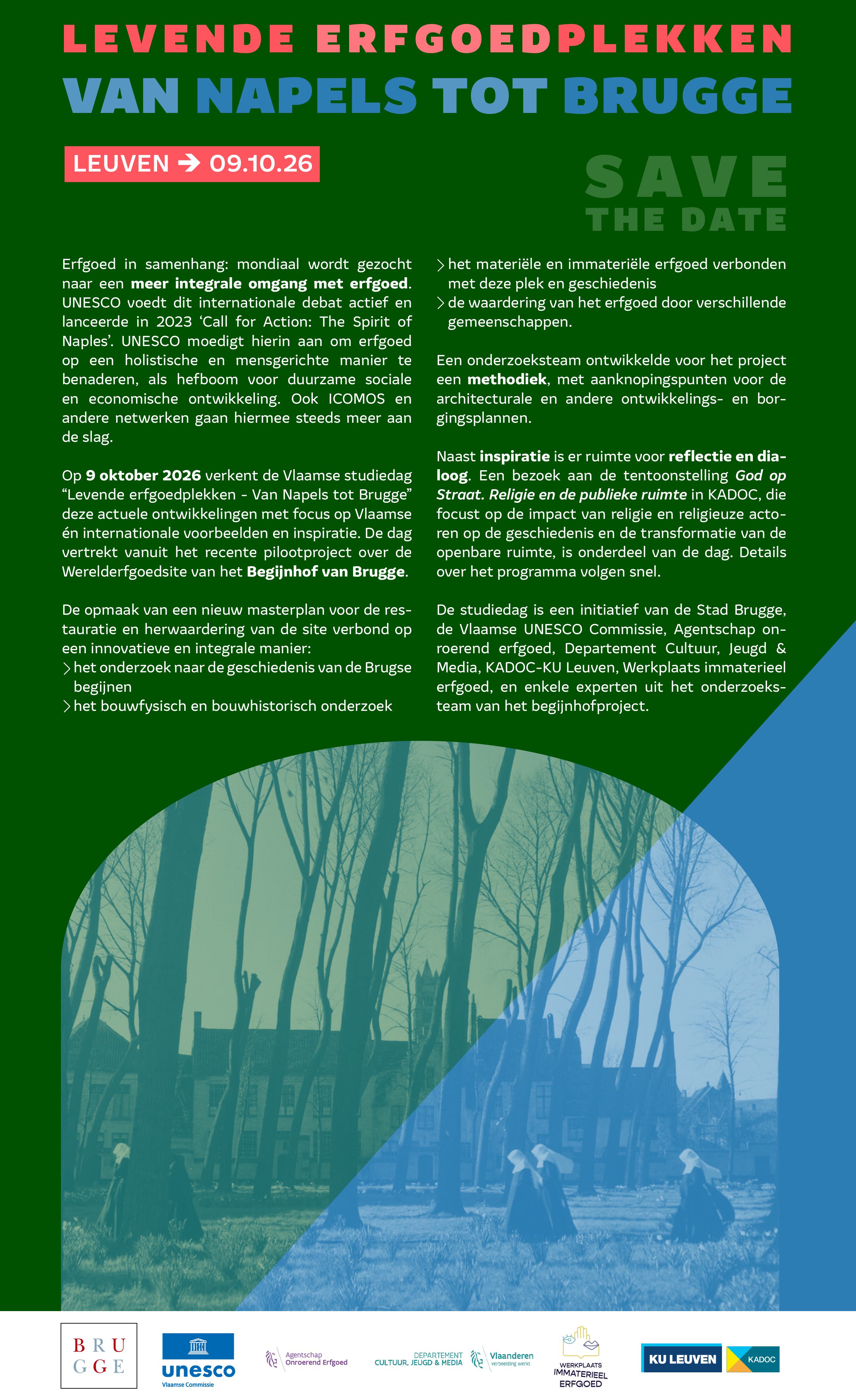 Op 9 oktober 2026 in Leuven verkent de Vlaamse studiedag “Levende erfgoedplekken - Van Napels tot Brugge” deze actuele ontwikkelingen met focus op Vlaamse én internationale voorbeelden en inspiratie. De dag vertrekt vanuit het recente pilootproject over de Werelderfgoedsite van het Begijnhof van Brugge.